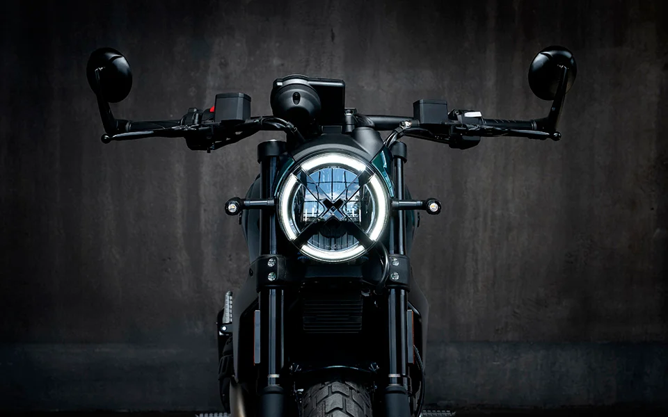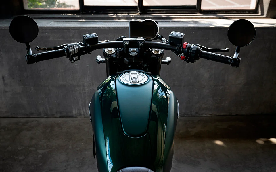 La Nightshift mantiene su esencia elegante y clásica, con detalles Café Racer como el asiento cosido, las placas porta números laterales, el guardabarros delantero minimalista y los intermitentes LED compactos. A esto se suma el contraste de las llantas de radios negras, el manillar plano de sección variable y los espejos retrovisores en los extremos, que realzan su aire sofisticado y dinámico.