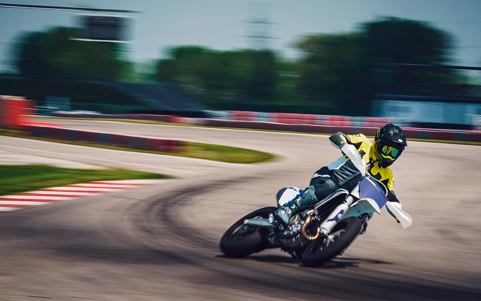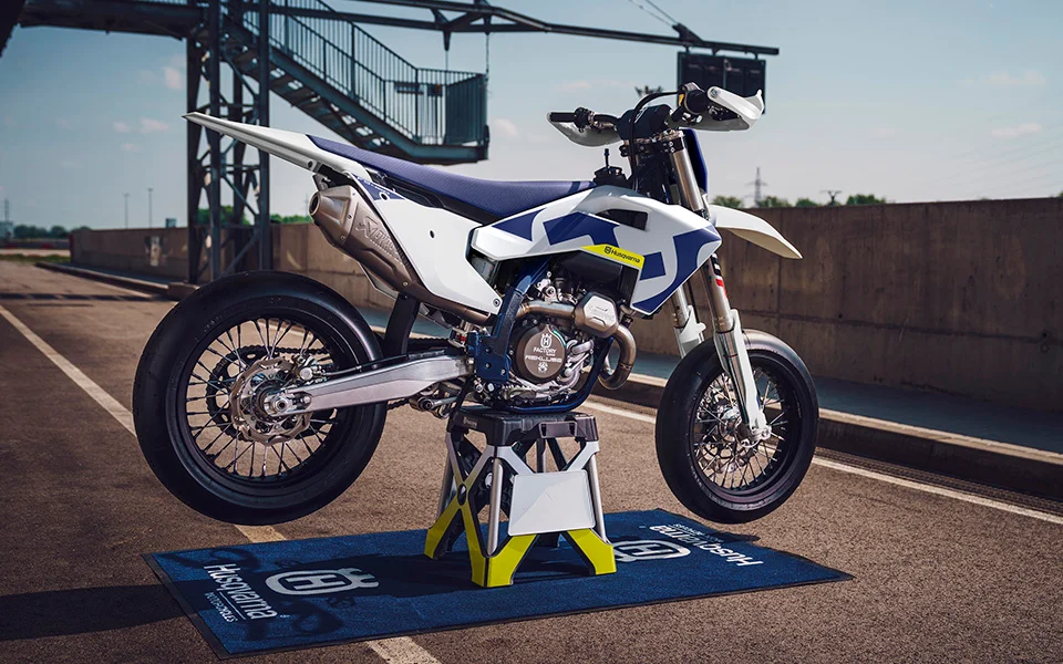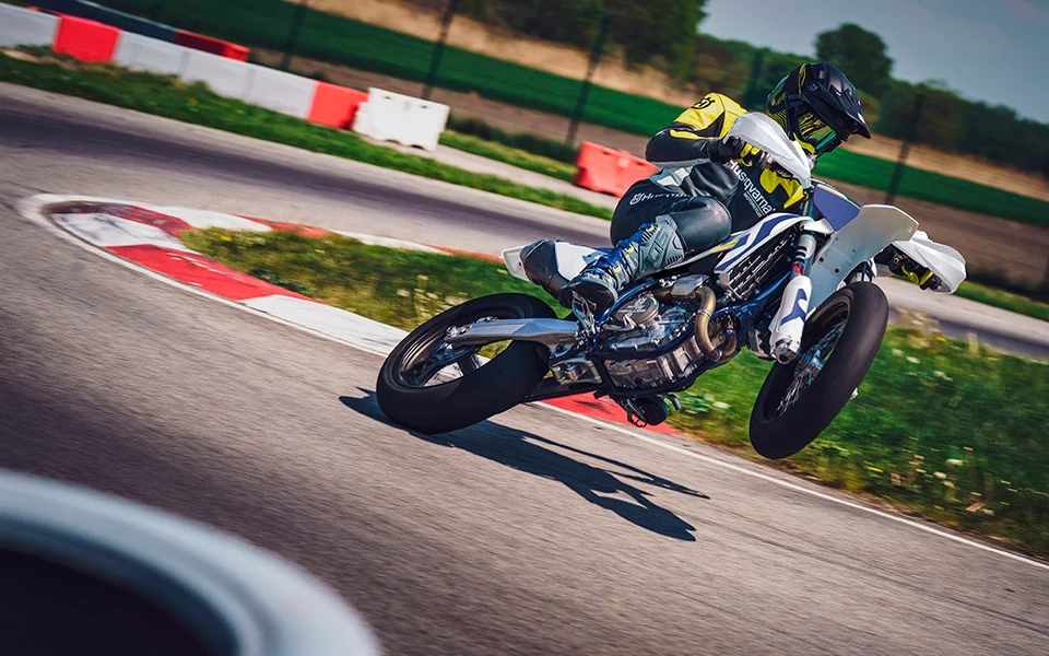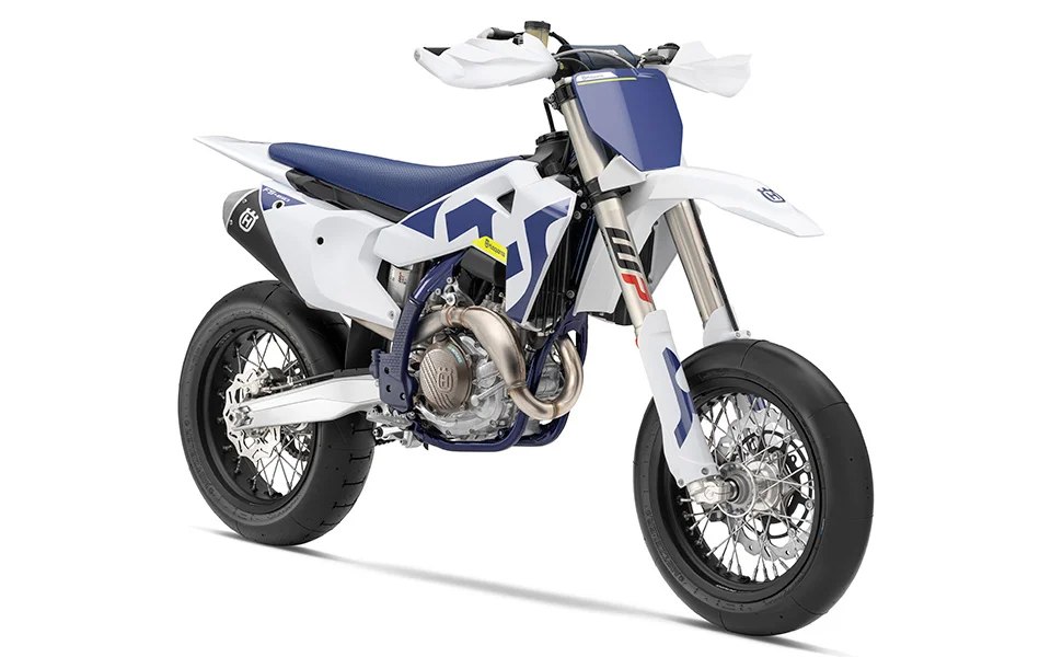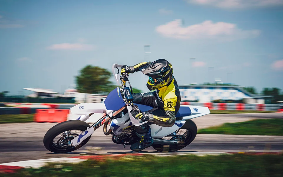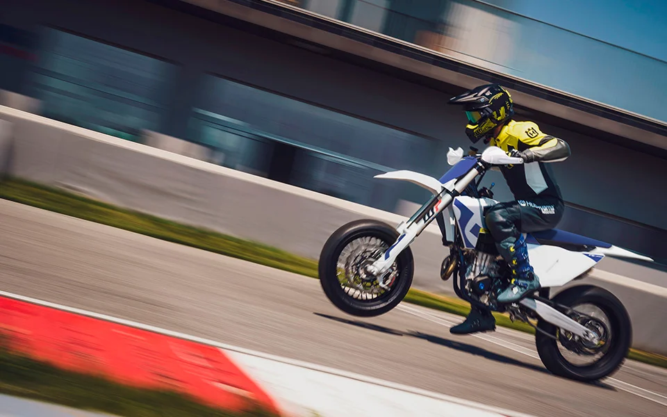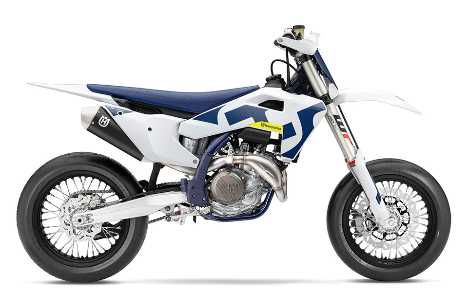 La FS 450 mantiene su esencia como una máquina hecha para el supermoto puro, combinando un chasis perfectamente equilibrado, suspensiones WP y neumáticos Metzeler Racetec SM K1, que permiten un control total y derrapes precisos en cada curva.