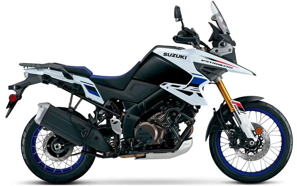 En lo más alto se encuentra la V-Strom 1050DE, equipada con motor V-twin de 1037 cc, control de tracción en modo Gravel, ABS desconectable para uso off-road y un conjunto de suspensiones y ruedas de 21/17 pulgadas que la hacen ideal para viajes largos y terrenos exigentes.